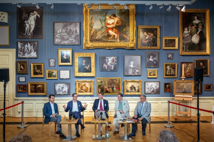 Abb. 9: Übergabe des Gemäldes „Gregor von Nazianz“, l. n. r.: Dr. Timo Trümper, Direktor Wissenschaft und Sammlungen der Friedenstein Stiftung Gotha Prof. Dr. Dirk Boll, Christie’s, Vorstand für Kunst des 20. und 21. Jahrhunderts Dr. Tobias Pfeifer-Helke, Direktor der Friedenstein Stiftung Gotha Dr. Martin Hoernes, Generalsekretär der Ernst von Siemens Kunststiftung Knut Kreuch, Stiftungsratsvorsitzender der Friedenstein Stiftung Gotha, Oberbürgermeister der Stadt Gotha