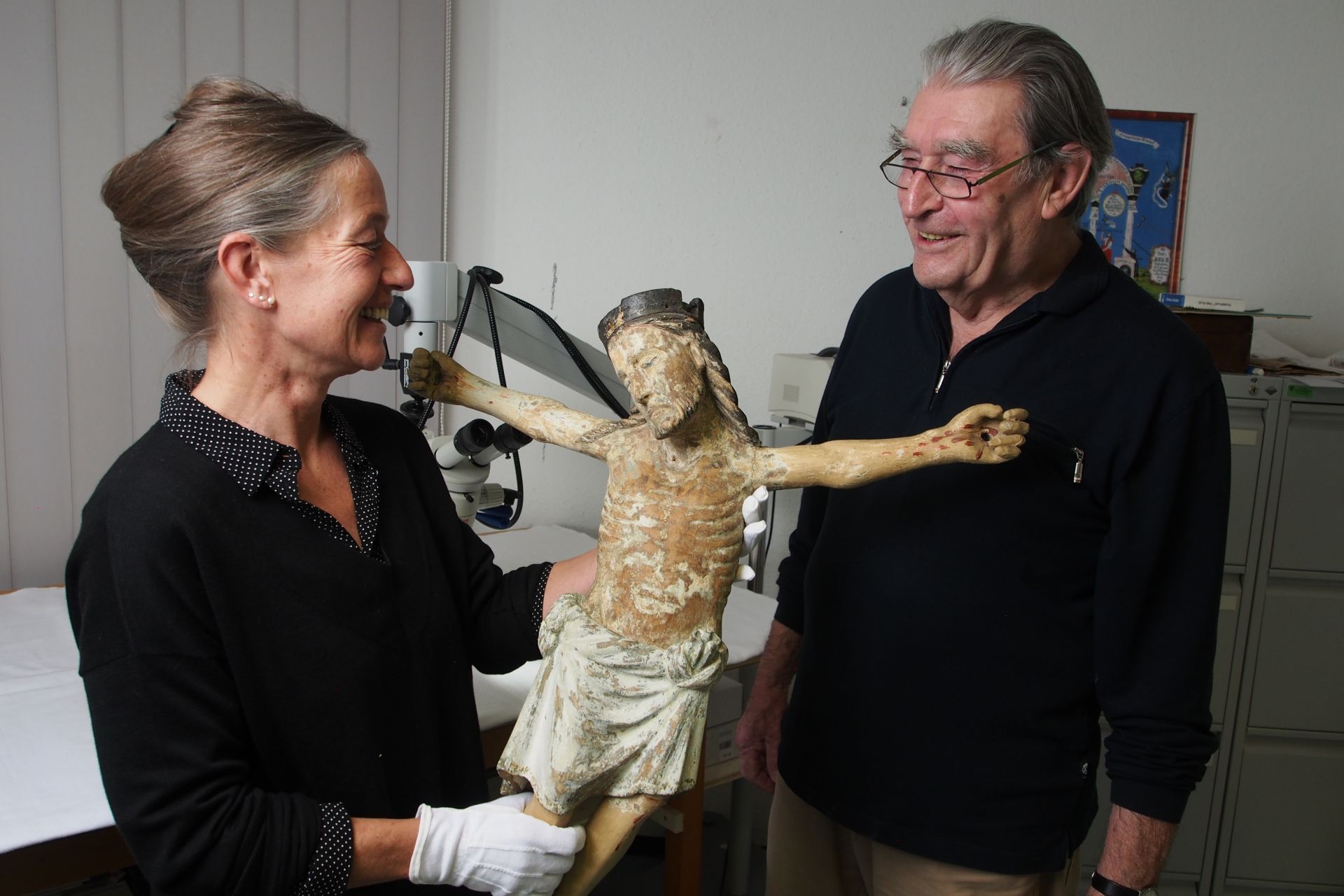 4 Museumsleiterin Petra Weber M. A. und Ehrenamtlicher Museumskustos Wolfgang Sauter bei der Begutachtung der Skulptur