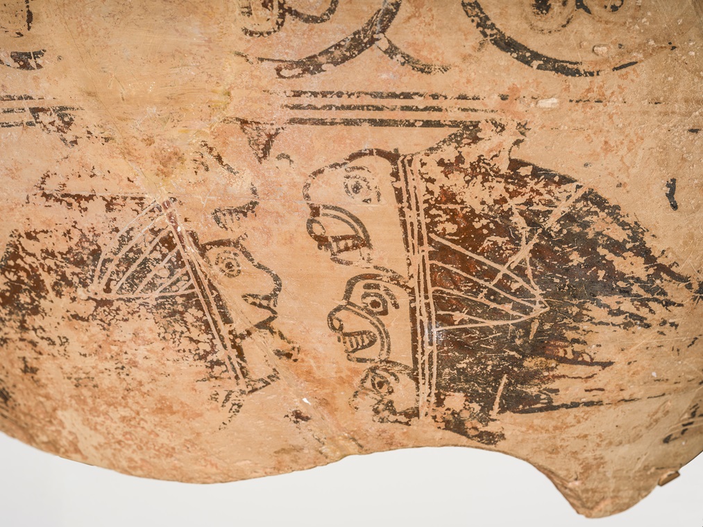 Abbildung 1: Junge Männer tragen eine Frau (Polyxena) zum Altar. Im unteren Bildregister zwei antithetische Seeungeheuer (Ketoi), die drei Löwenköpfe mit einem Fischleib verbinden. Fragment der Vorderseite eines mittelprotoattischen Kraters.