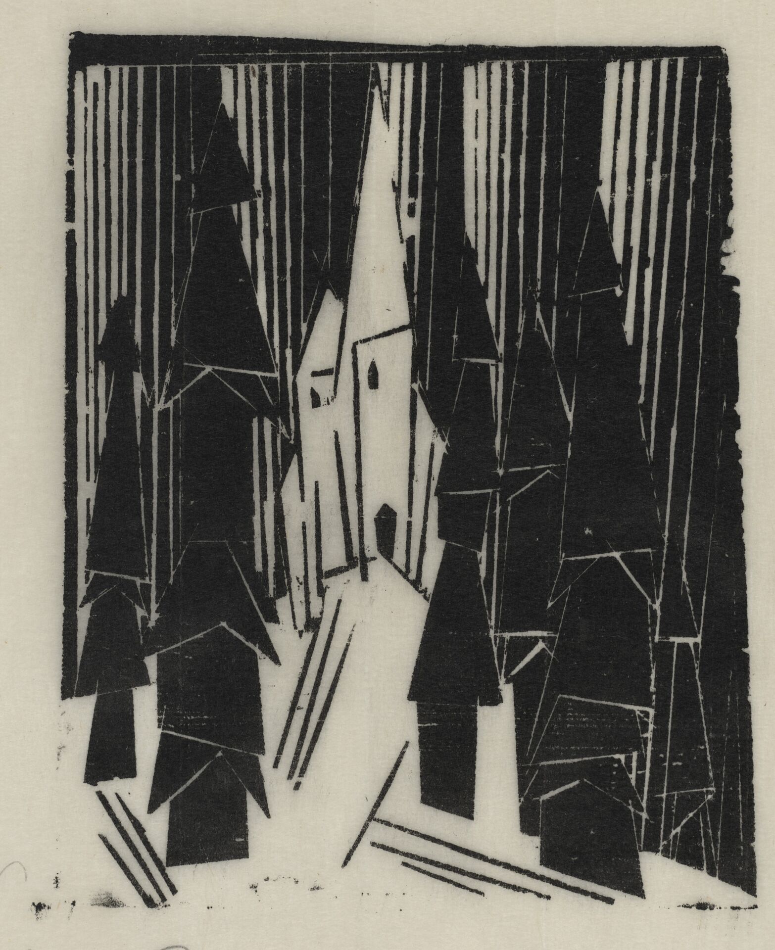 Abbildung 3: Lyonel Feininger, Waldkirche, 1920, Holzschnitt / Japan, dünn, Bildgröße: 143 x 115 mm, Blattmaß: 242 x 204 mm, Holzschnitt