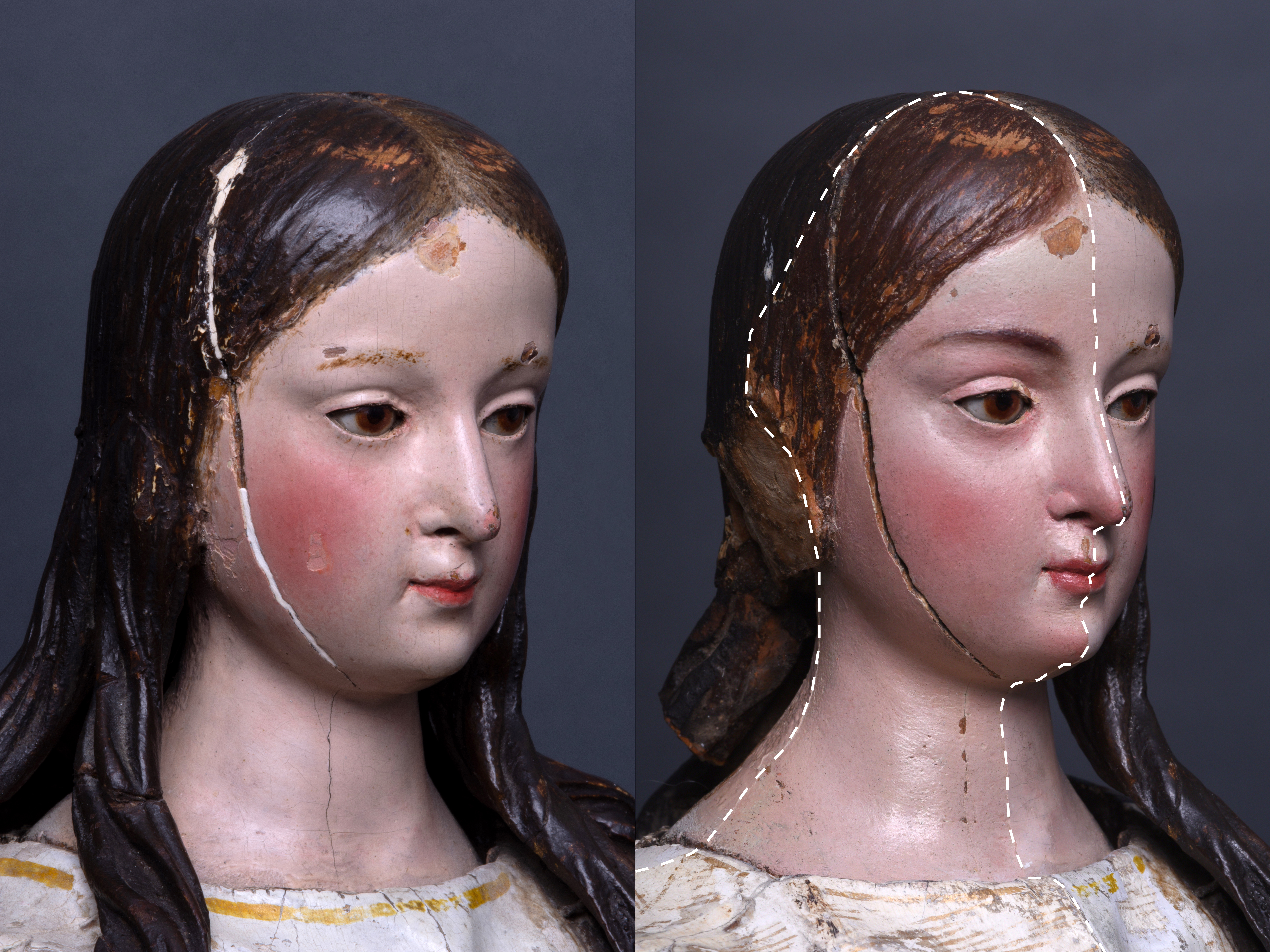 Abb. 1&2: Gesicht im übermalten Zustand (links), linke Gesichtshälfte weitgehend auf die künstlerisch hochwertigere Originalmalschicht freigelegt (rechts)