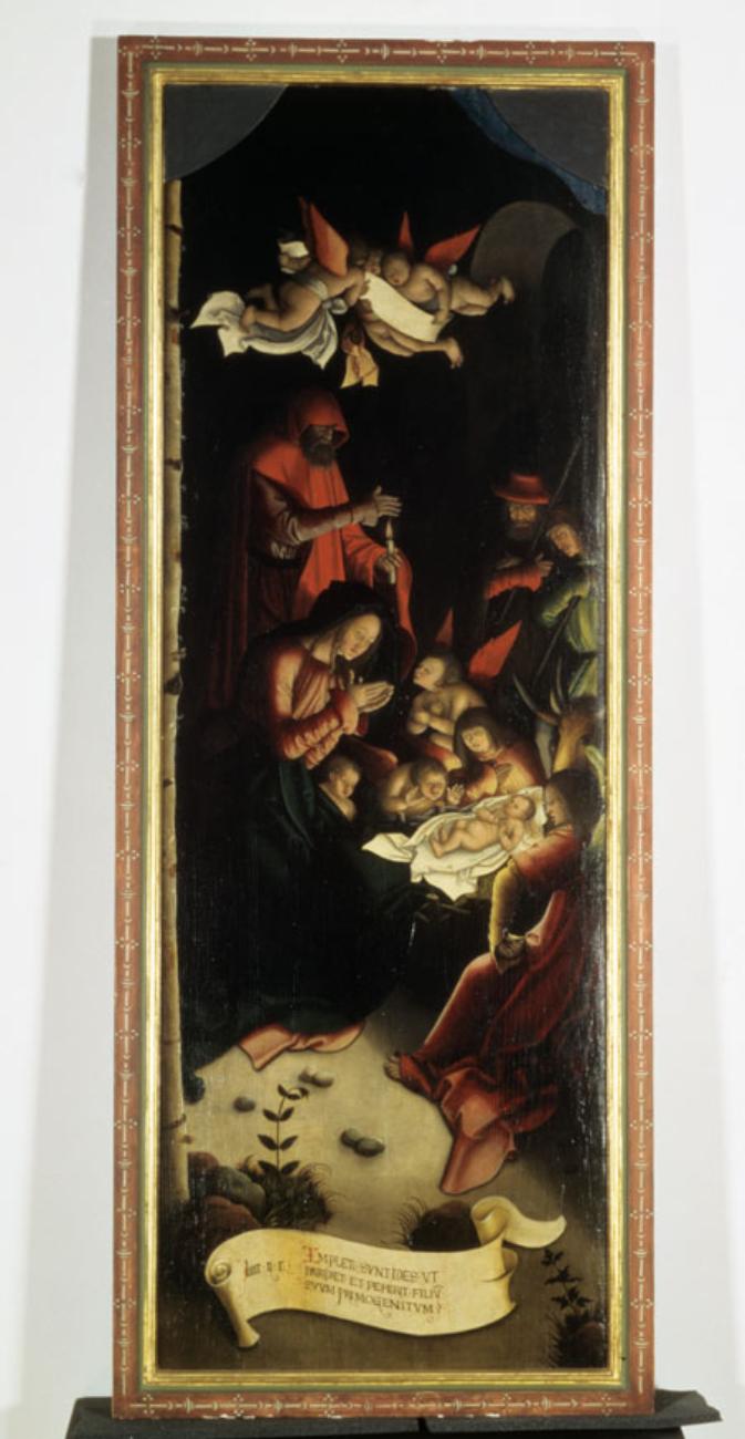 Das Mittelteil des Altars - der Schrein mit dem Marientod - war 1881 aus großherzoglich-badischem Besitz der „Altertümersammlung“ in Karlsruhe, dem Vorläufer des Badischen Landesmuseums, geschenkt worden. Der Neuerwerb der Altarflügel und Predella eröffnete so die Möglichkeit, die verstreuten Teile eines der großartigsten Altäre der Dürerzeit wieder zusammenzuführen. Bernhard Strigel zählt zu den führenden Künstlern seiner Zeit. Rund zehn Jahre älter als Albrecht Dürer - in der Komposition seiner Bilder bald von dessen Graphik beeinflusst -, übertraf Strigel ihn jedoch in der intensiven Leuchtkraft seiner Farben. Ungewöhnlich aber auch in seinem Œuvre ist die nächtliche Darstellung der Geburt Christi: Alles Licht geht von dem Kind aus, alle Farben scheinen sich erst beim Auftreffen des Lichtes zu entfalten. Nur wenige niederländische Maler haben derartige Nacht-Szenen versucht, ehe Meister der Barockzeit auf diese Weise virtuose Effekte erzielten.